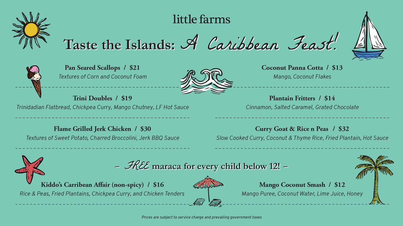 Set sail on a vibrant Caribbean adventure! Begin with the delicate Pan Seared Scallops kissed with corn and coconut foam, then dive into the bold flavours of Trini Doubles, soft flatbread layered with chickpea curry, mango chutney, and a kick of LF Hot Sauce.