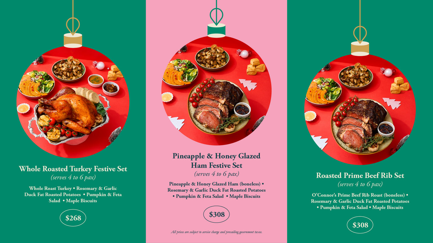 Celebrate the season with three festive centrepieces: Whole Roasted Turkey, Prime Beef Rib Roast, or Pineapple & Honey Glazed Ham.